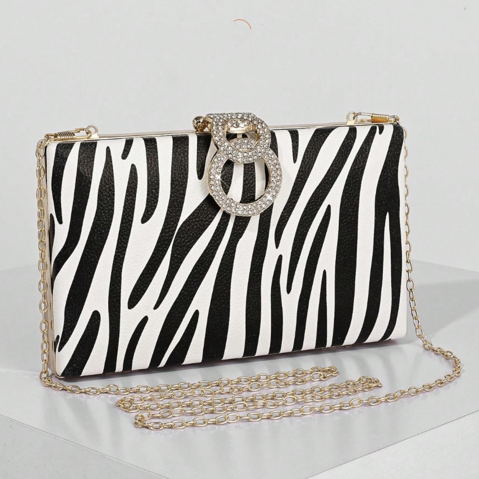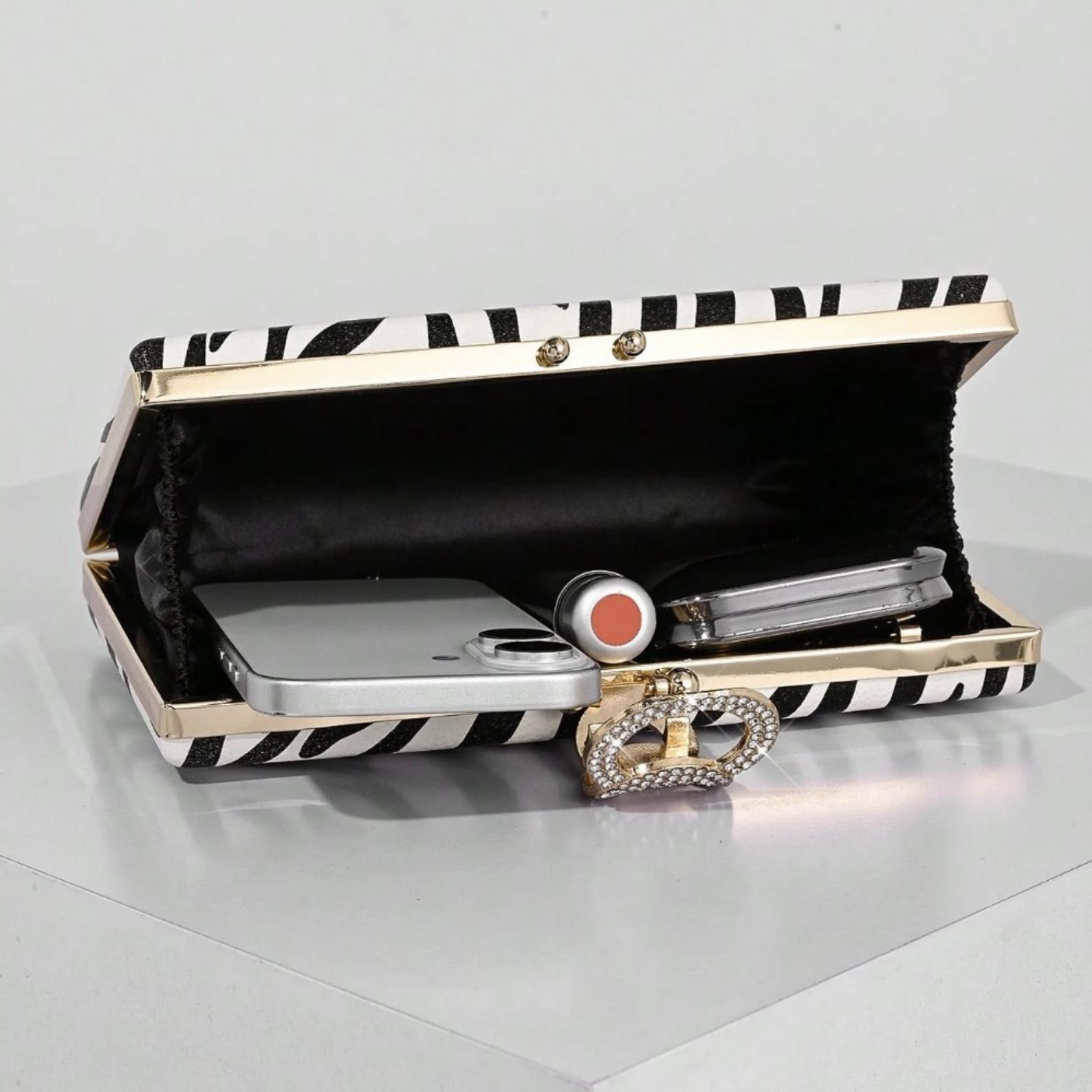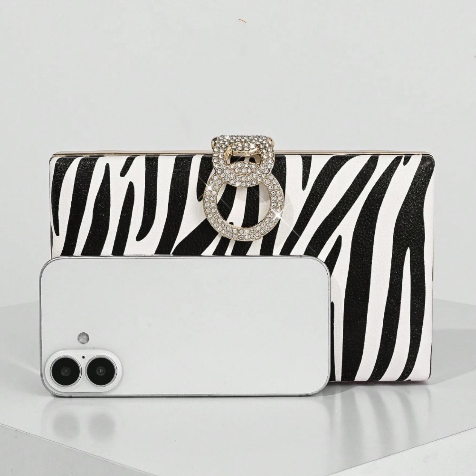 This black and white zebra print evening clutch combines bold pattern with elegant sparkle. Designed with a structured box silhouette, gold-tone frame, and crystal ring clasp, it adds a chic statement to party dresses and formal outfits for weddings, prom, and cocktail events.