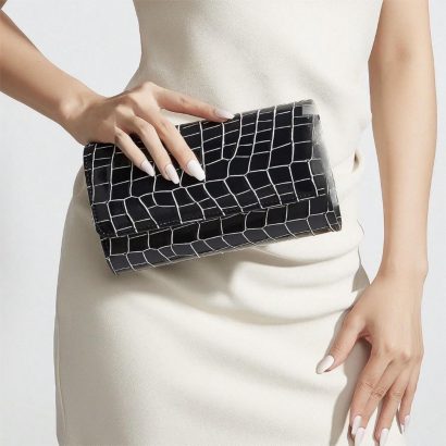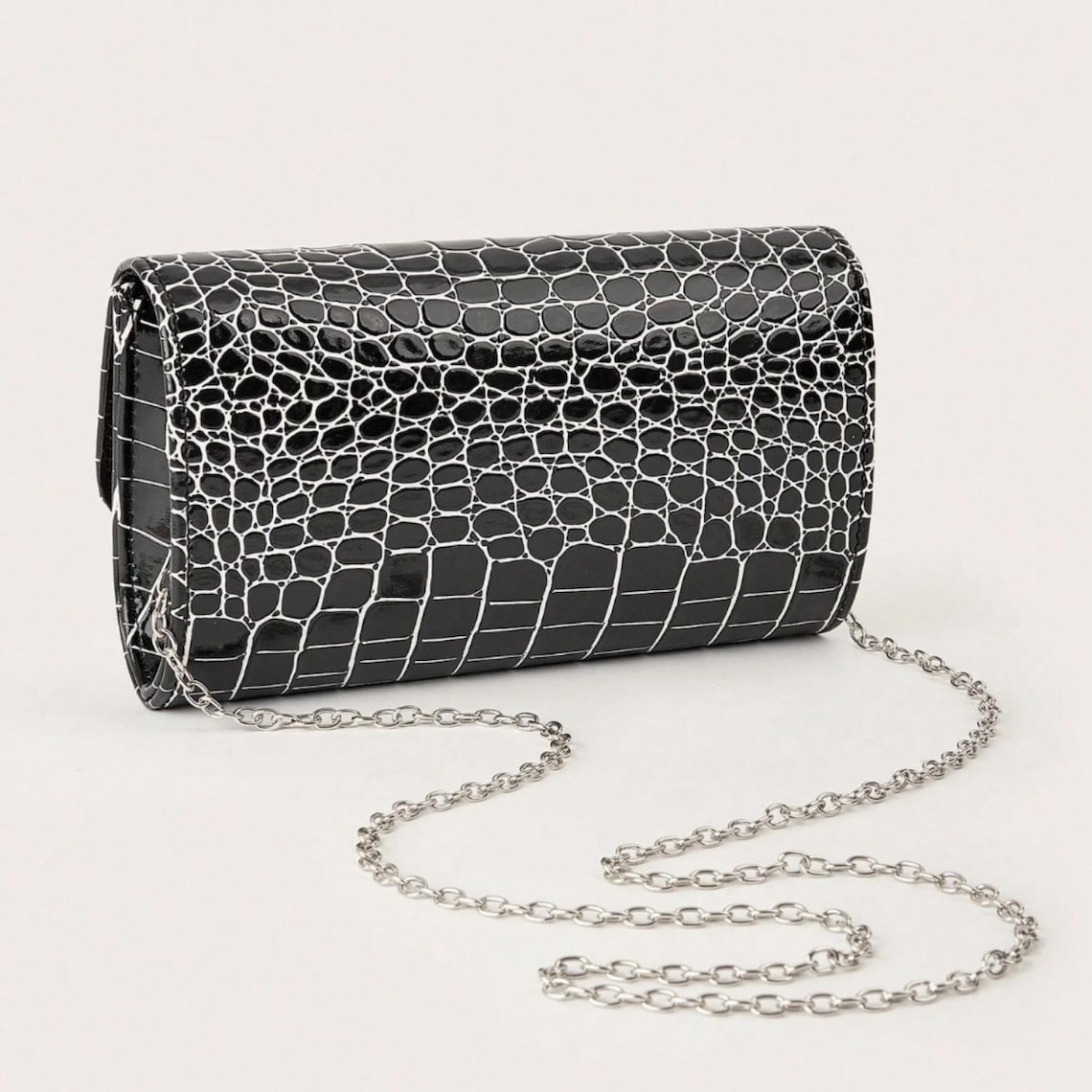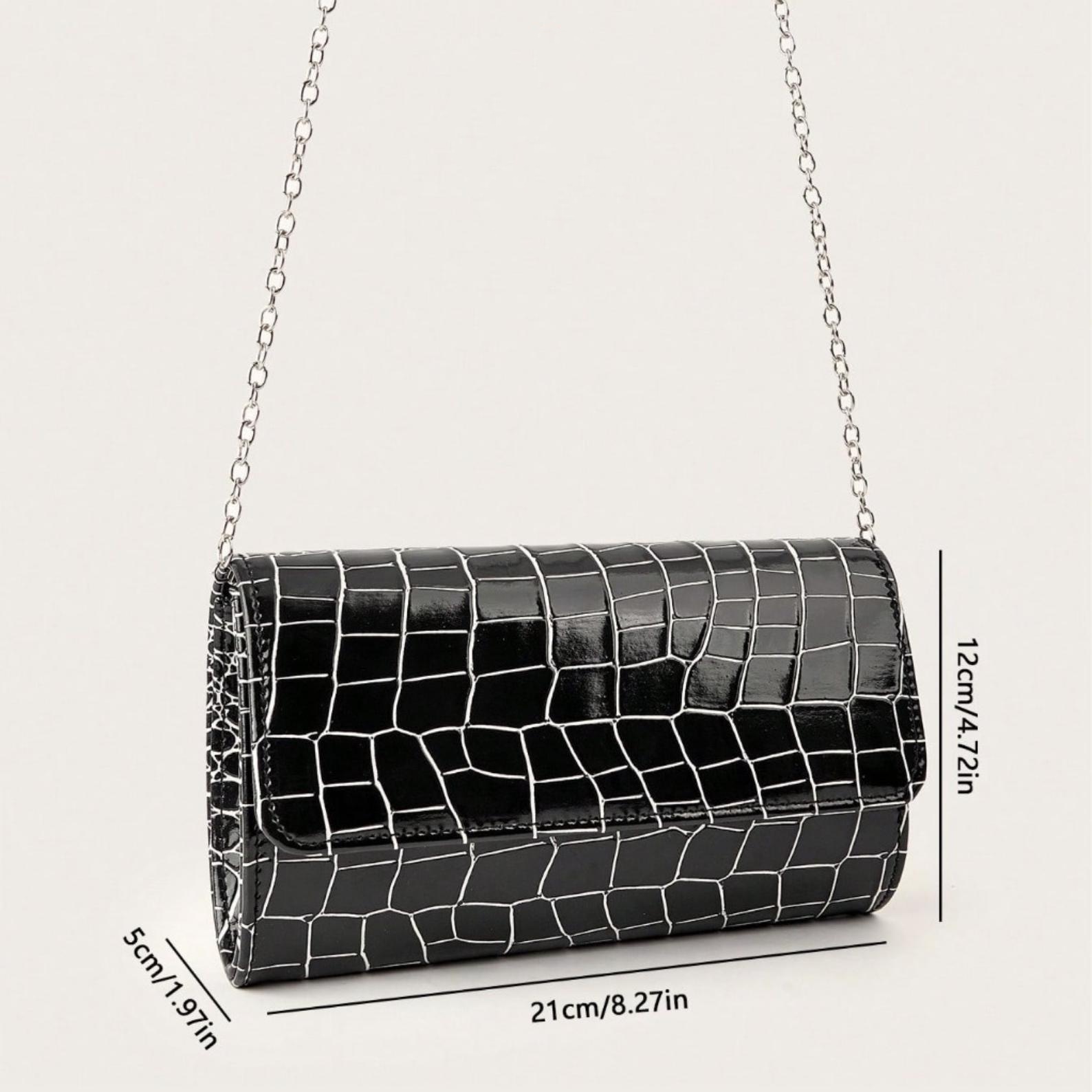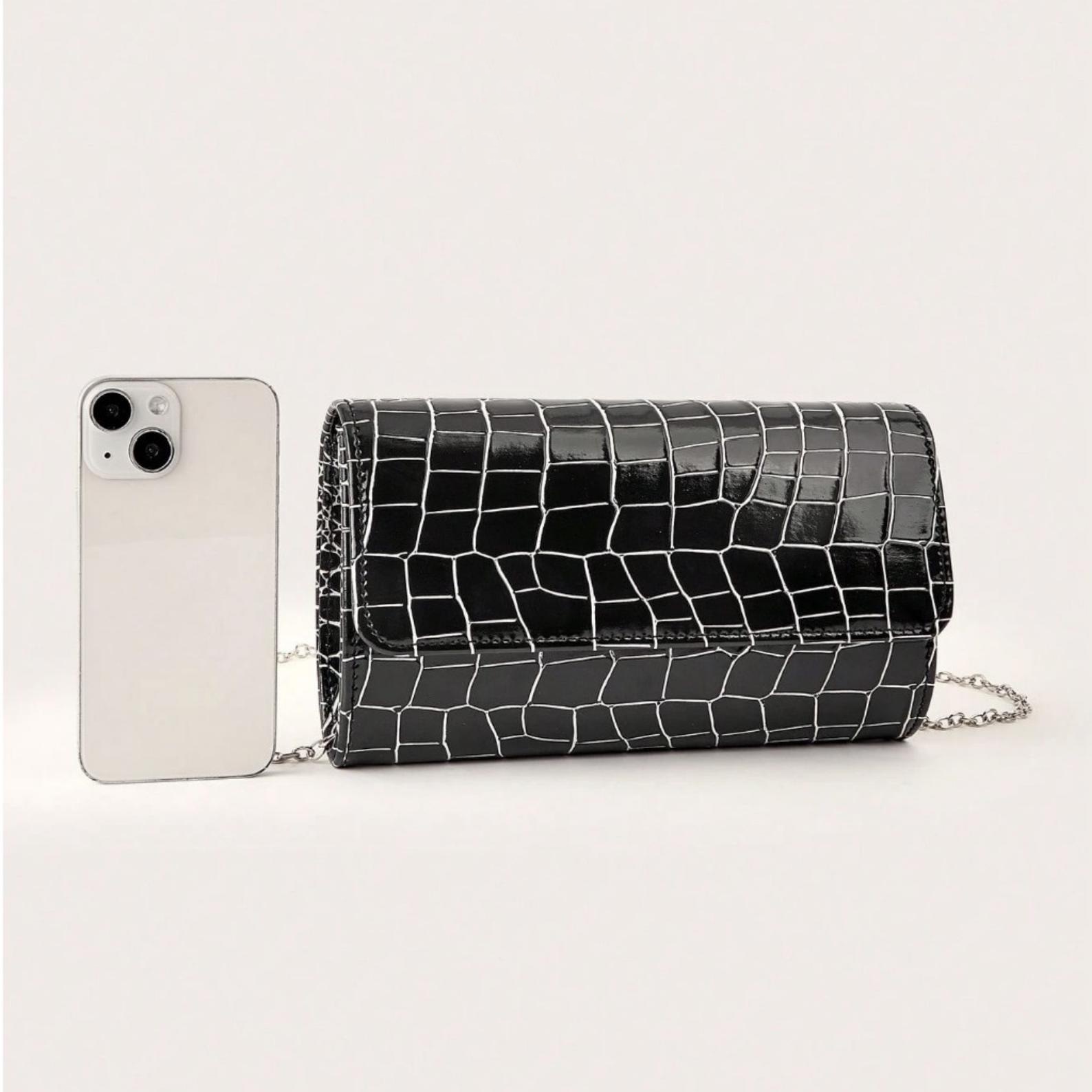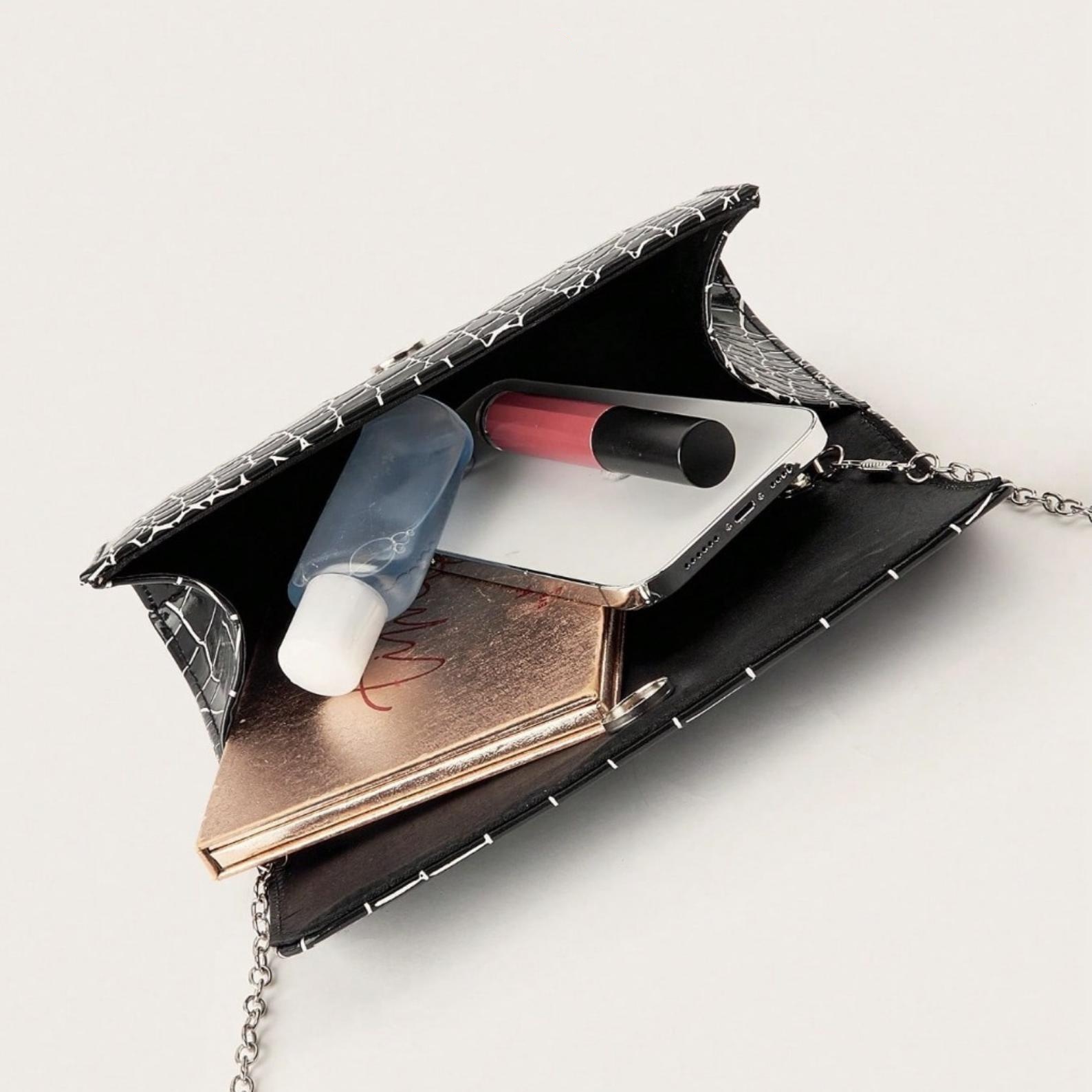 This black evening clutch features a glossy croc-embossed finish and a classic envelope-style silhouette for an elegant, modern formal look. Designed with a chain strap for versatile wear, it pairs beautifully with party dresses and evening outfits for weddings, prom, cocktail events, and special occasions.