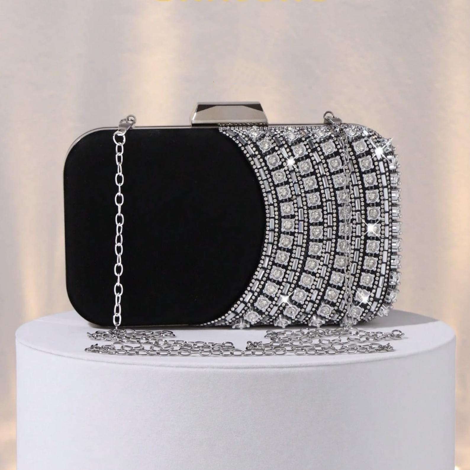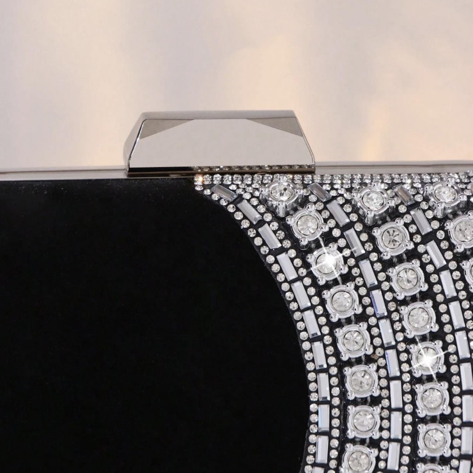This black evening clutch combines classic elegance with eye-catching sparkle. Designed with a structured box silhouette, silver-tone clasp, and rhinestone stripe embellishment, it adds a refined statement to formal dresses and party outfits. A stylish choice for weddings, prom, cocktail parties, and special occasions.