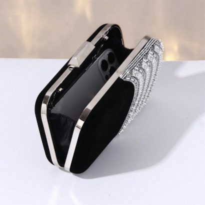 Elegant Contrast Design: Black evening clutch with a sleek satin-like finish and sparkling rhinestone stripe panel for a glamorous formal look.