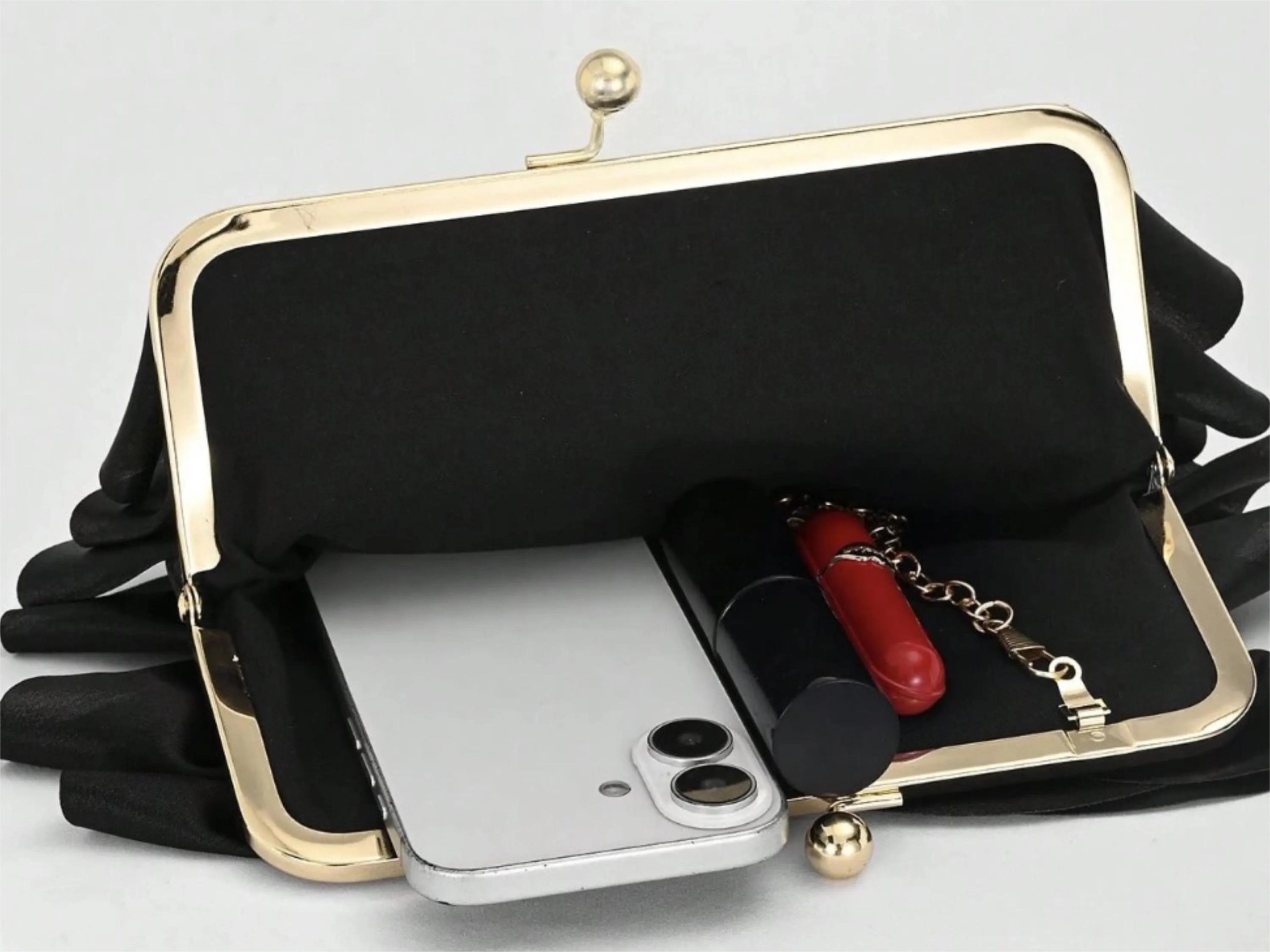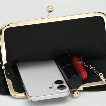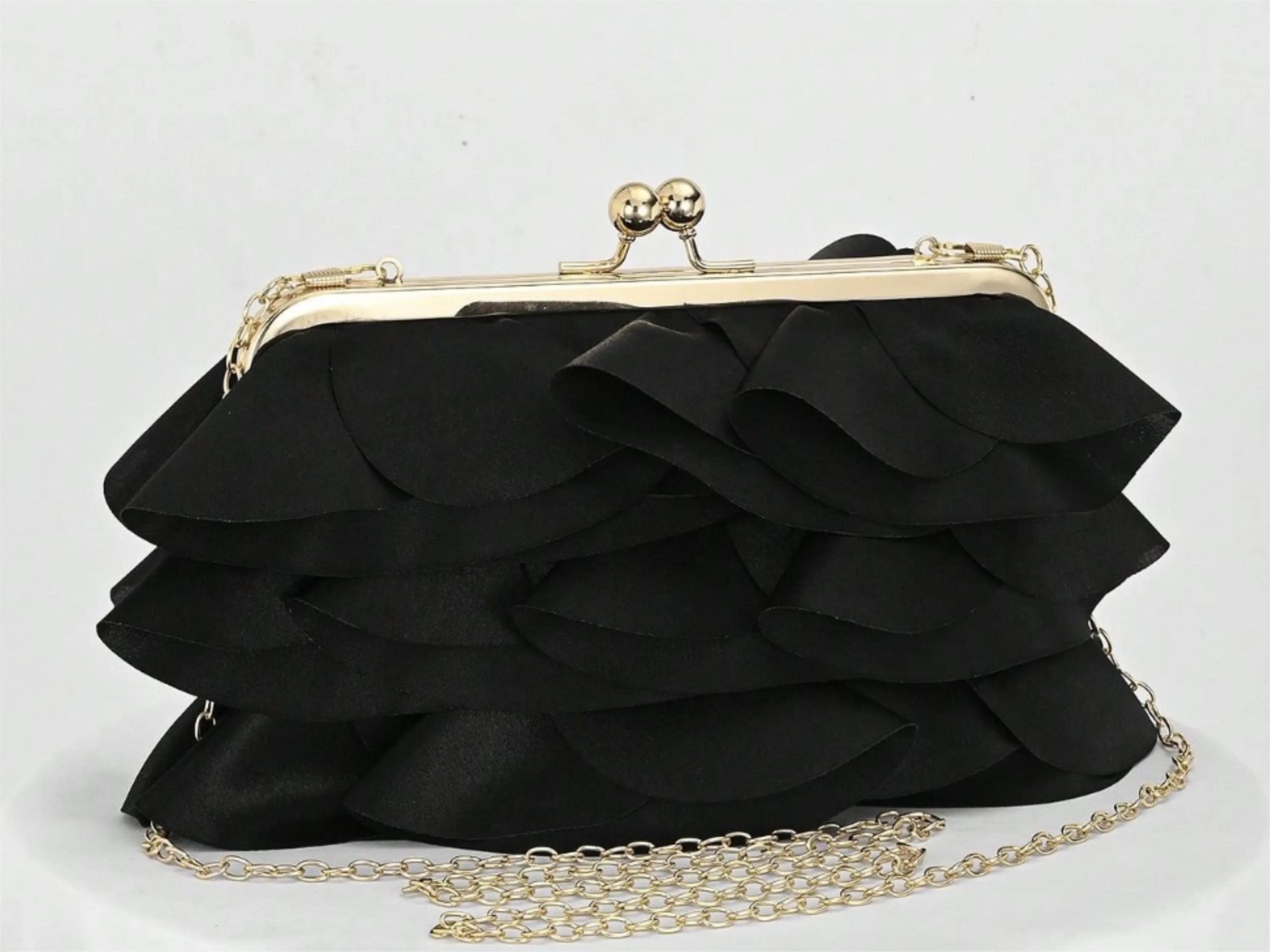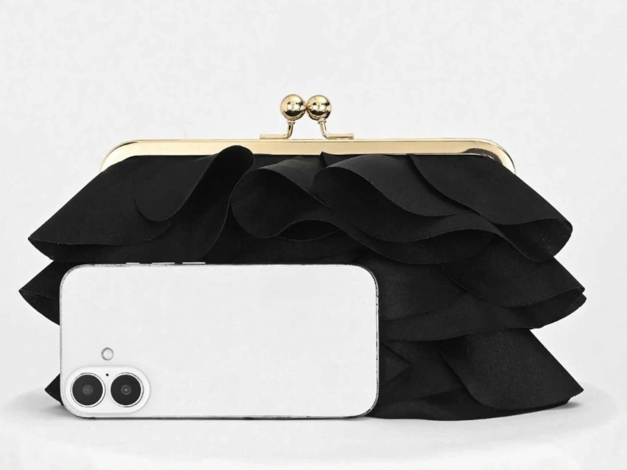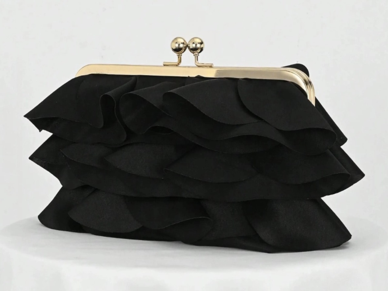 This black evening clutch features eye-catching layered ruffles and a satin-like finish for a chic, elegant statement. Designed with a gold-tone frame and classic kiss lock clasp, it pairs beautifully with cocktail dresses and formal outfits for weddings, prom, and special occasions while keeping essentials neatly stored.