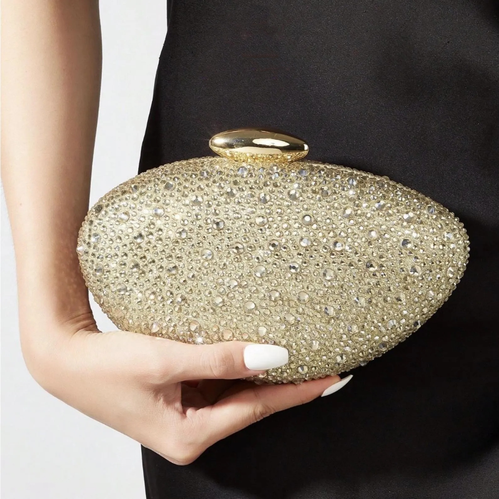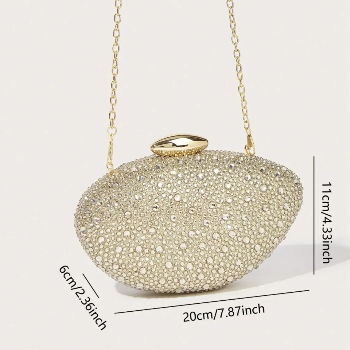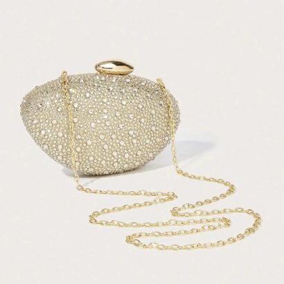 This champagne gold evening clutch features a structured oval box silhouette covered in sparkling rhinestones and crystal embellishments for a glamorous statement finish. Designed with a gold-tone top clasp and chain strap, it is a beautiful accessory for weddings, prom, cocktail parties, and other formal occasions while keeping essentials neatly stored.