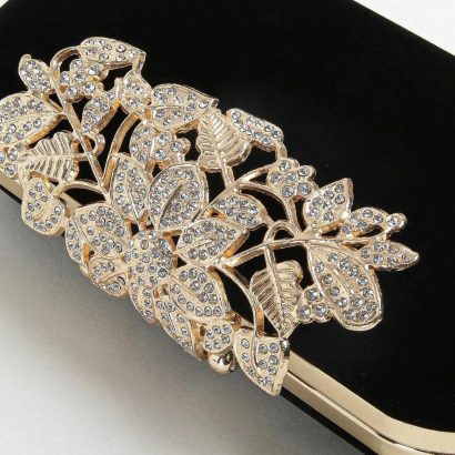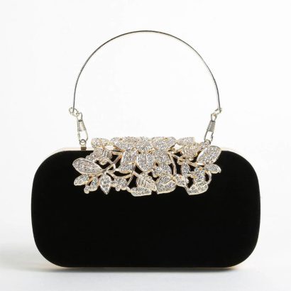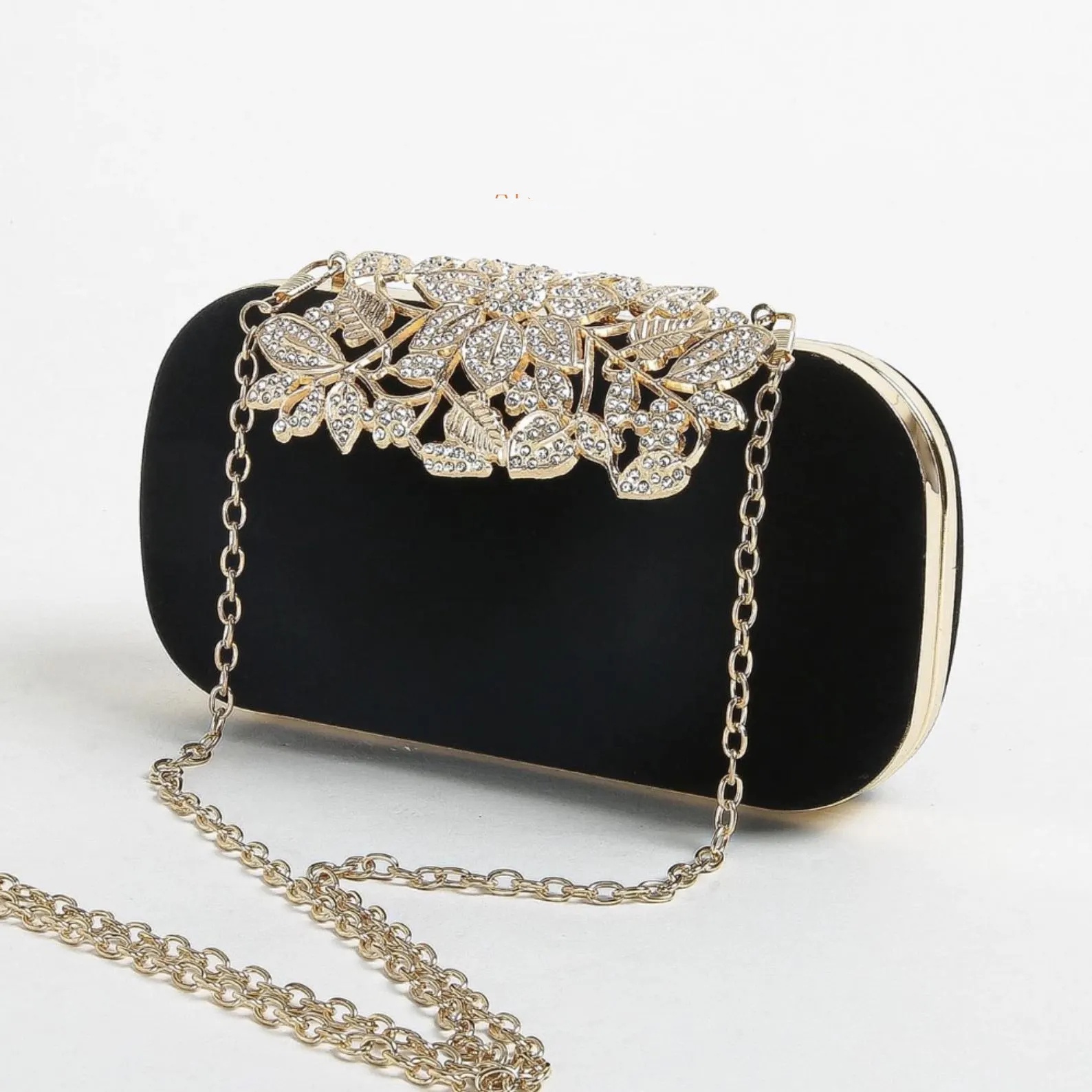 This black velvet evening clutch combines classic elegance with eye-catching sparkle. Designed with a structured box silhouette and a crystal floral clasp in gold-tone hardware, it adds a sophisticated finishing touch to wedding guest dresses, prom outfits, and cocktail looks while keeping essentials neatly stored.