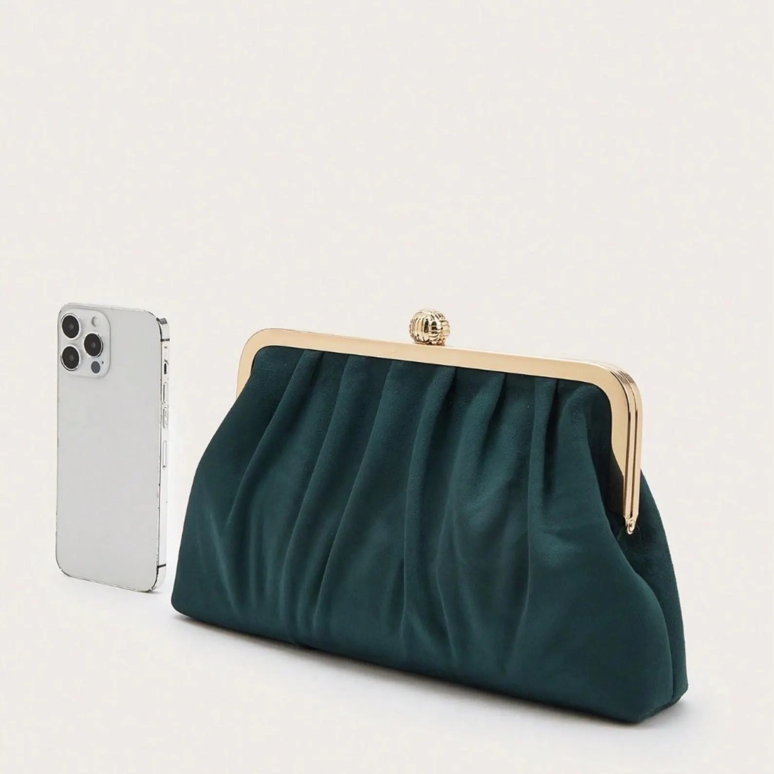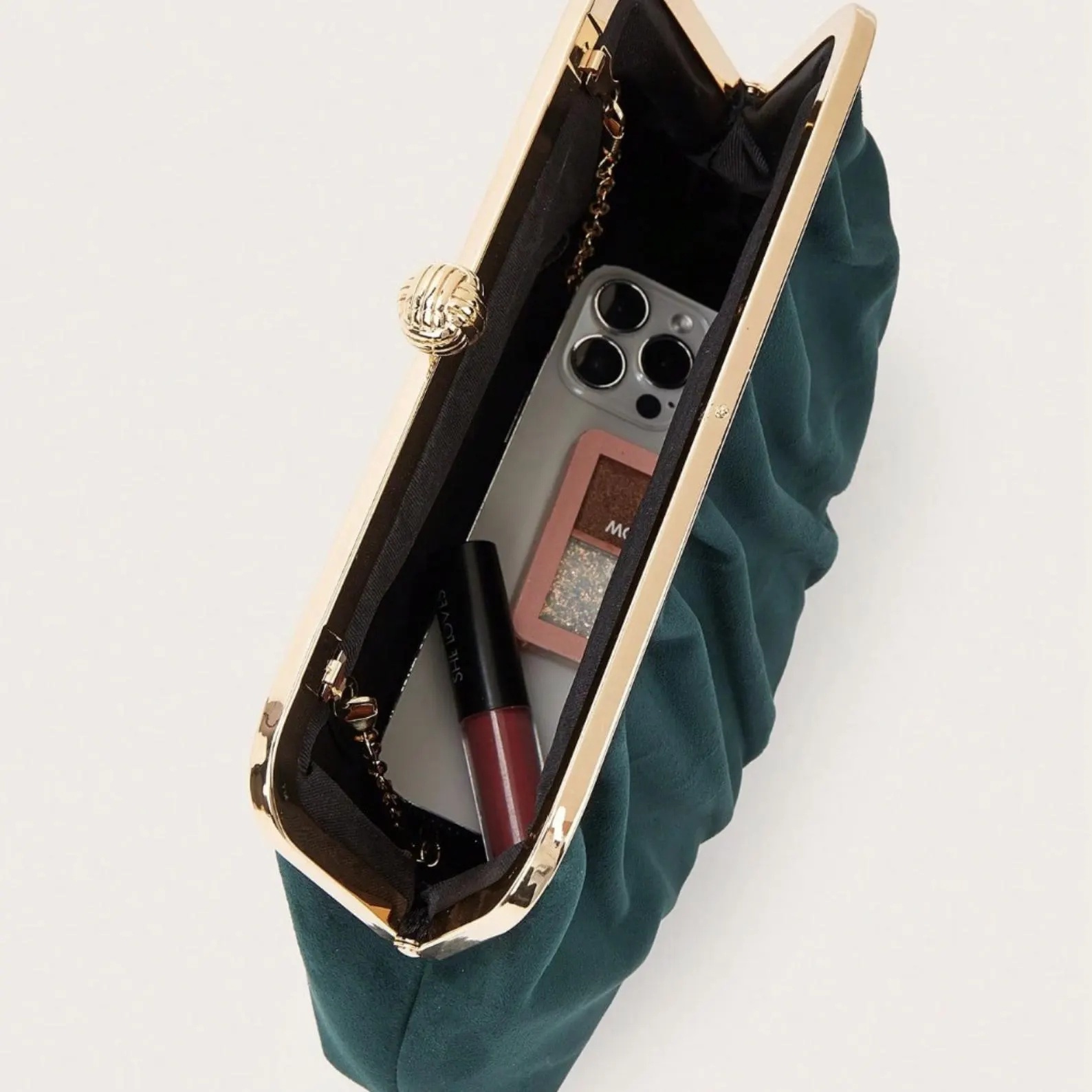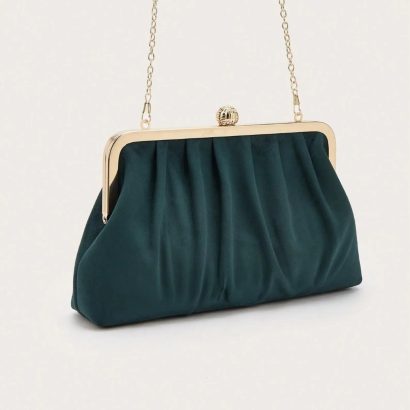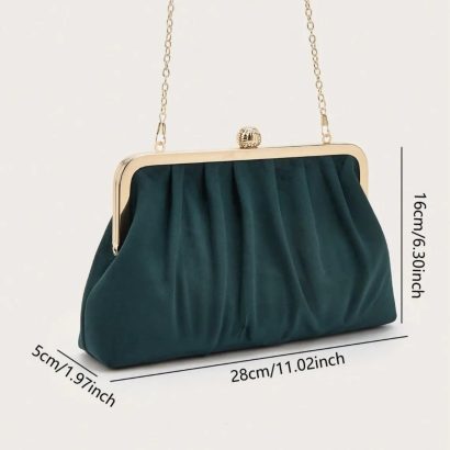 This deep teal evening clutch features a soft gathered silhouette, elegant gold-tone frame, and classic kiss lock clasp for a polished formal finish. Designed with a chain strap for versatile styling, it is a chic accessory for weddings, cocktail parties, prom, and special occasion outfits.