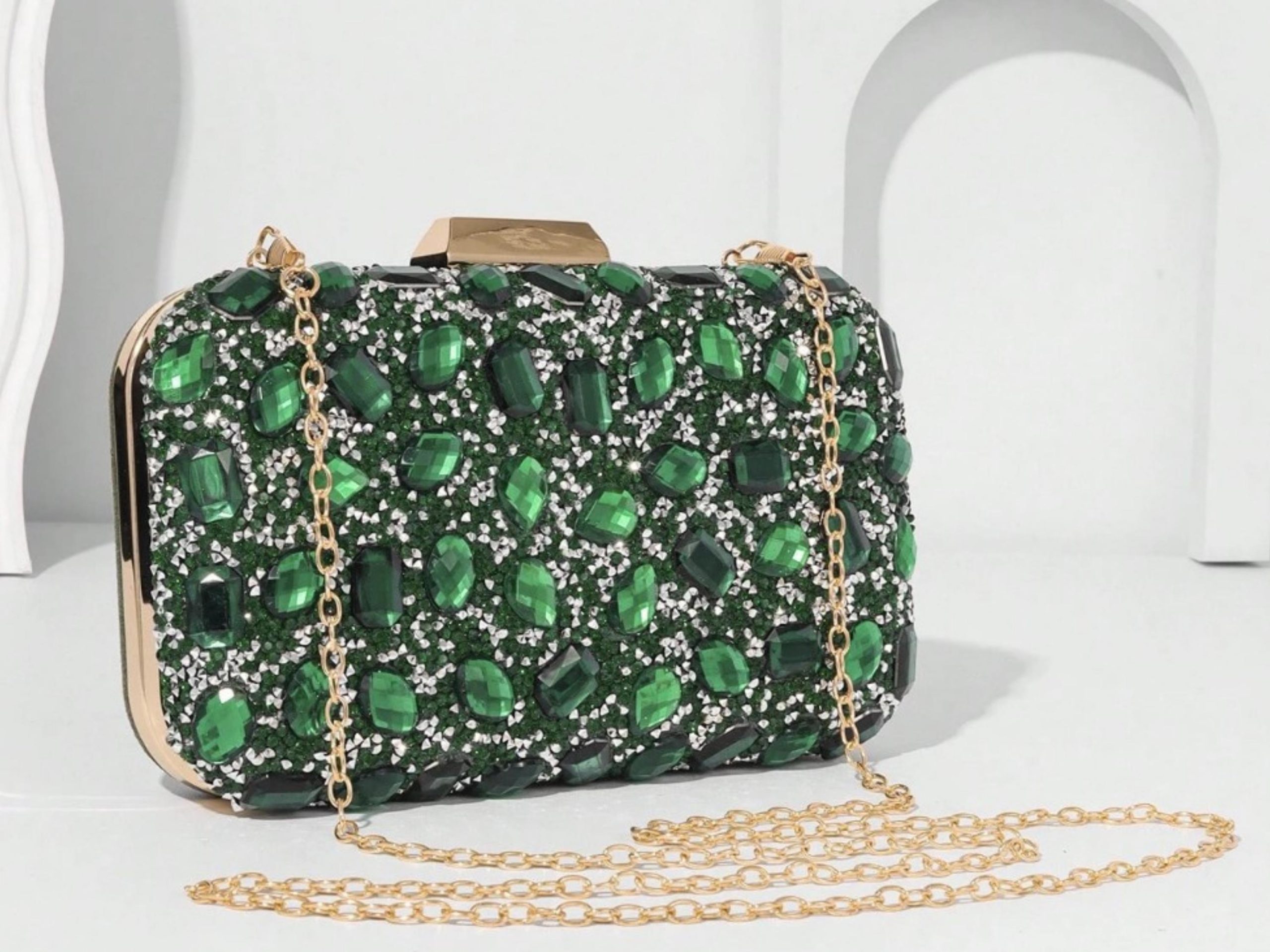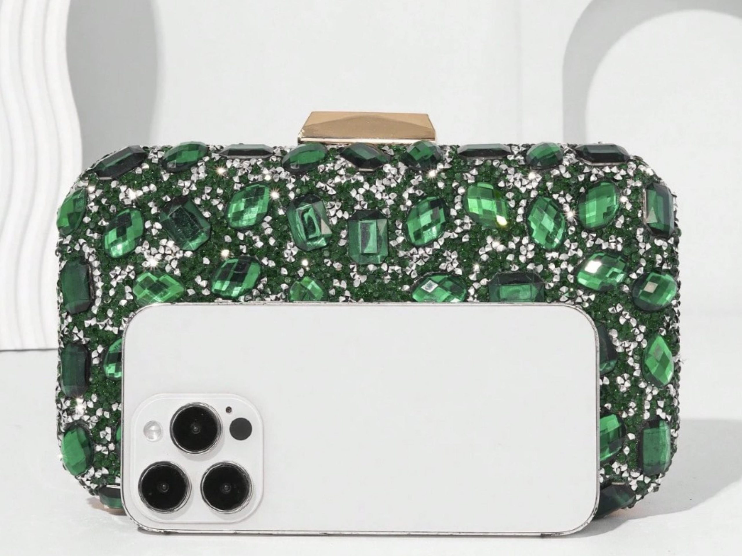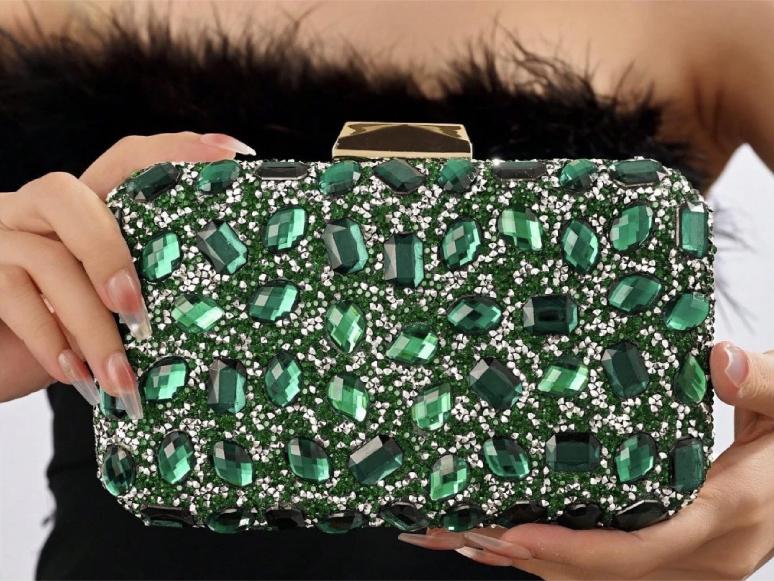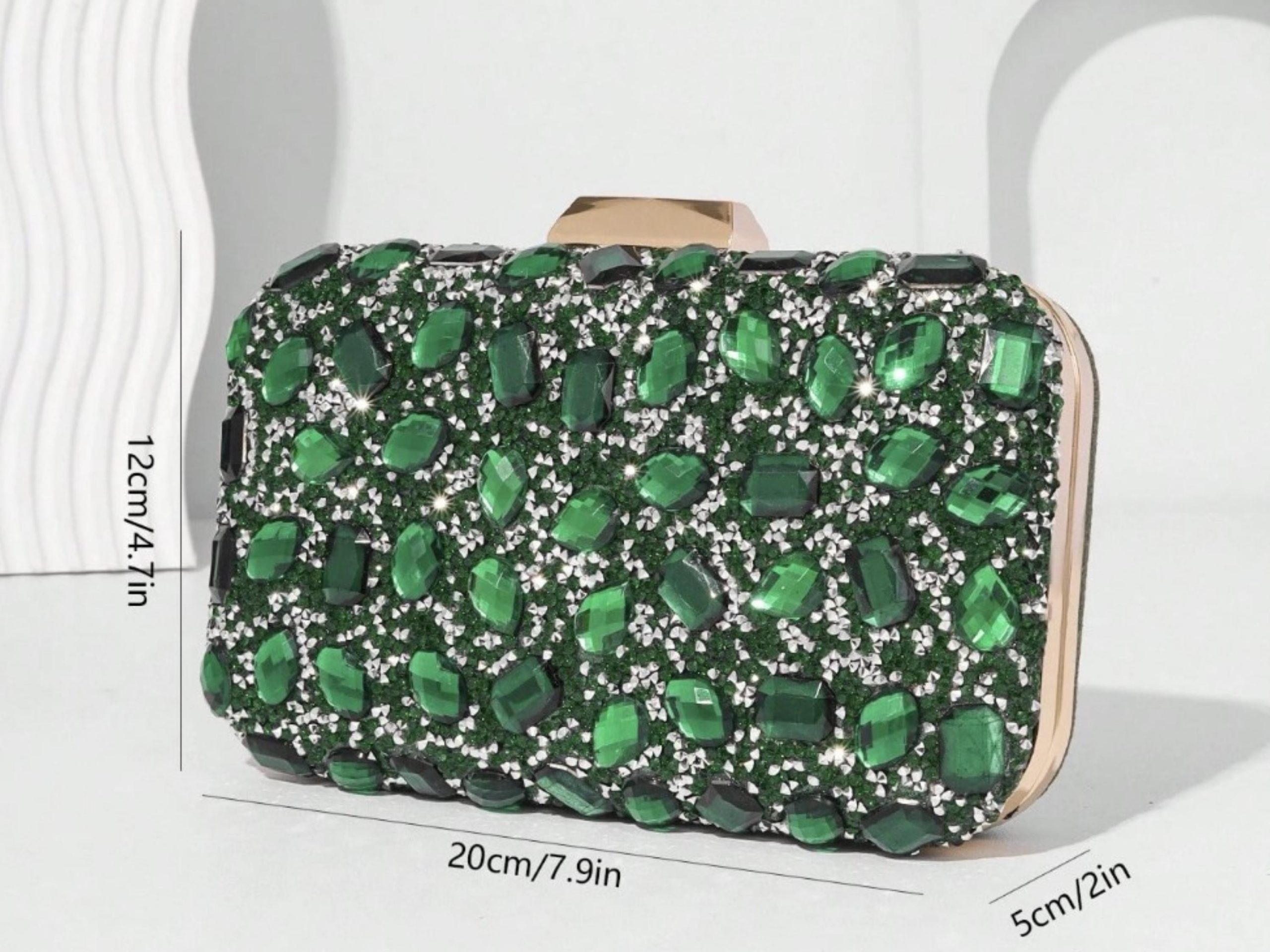 Luxury Sparkle Design: Emerald green evening clutch covered with faceted crystal gems and rhinestones for a bold, glamorous look.