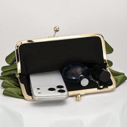This olive green evening clutch features eye-catching layered ruffles and a satin-like sheen for an elegant, feminine finish. Designed with a gold-tone frame and classic kiss lock clasp, it adds stylish texture and charm to wedding guest outfits, party dresses, and formal occasion looks.