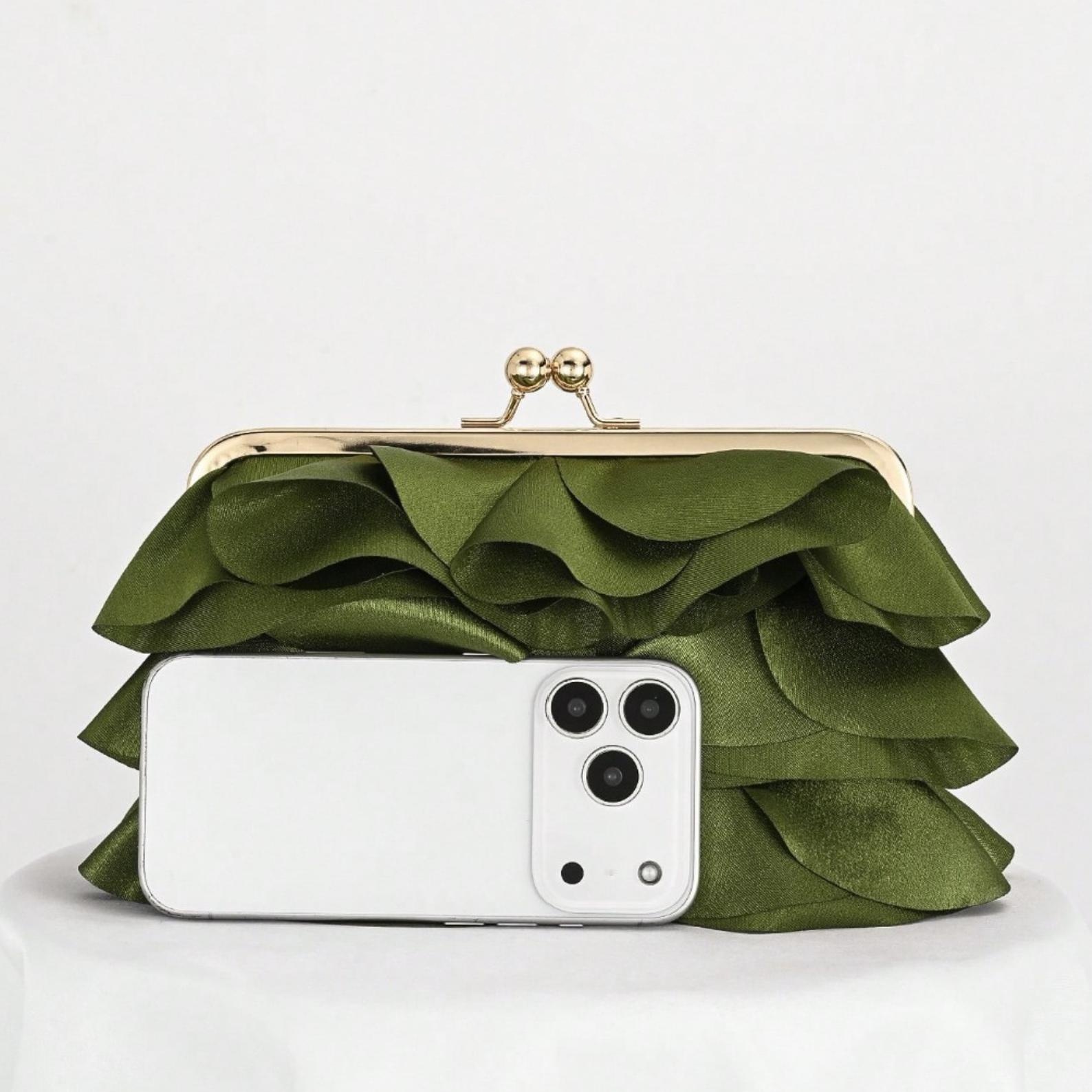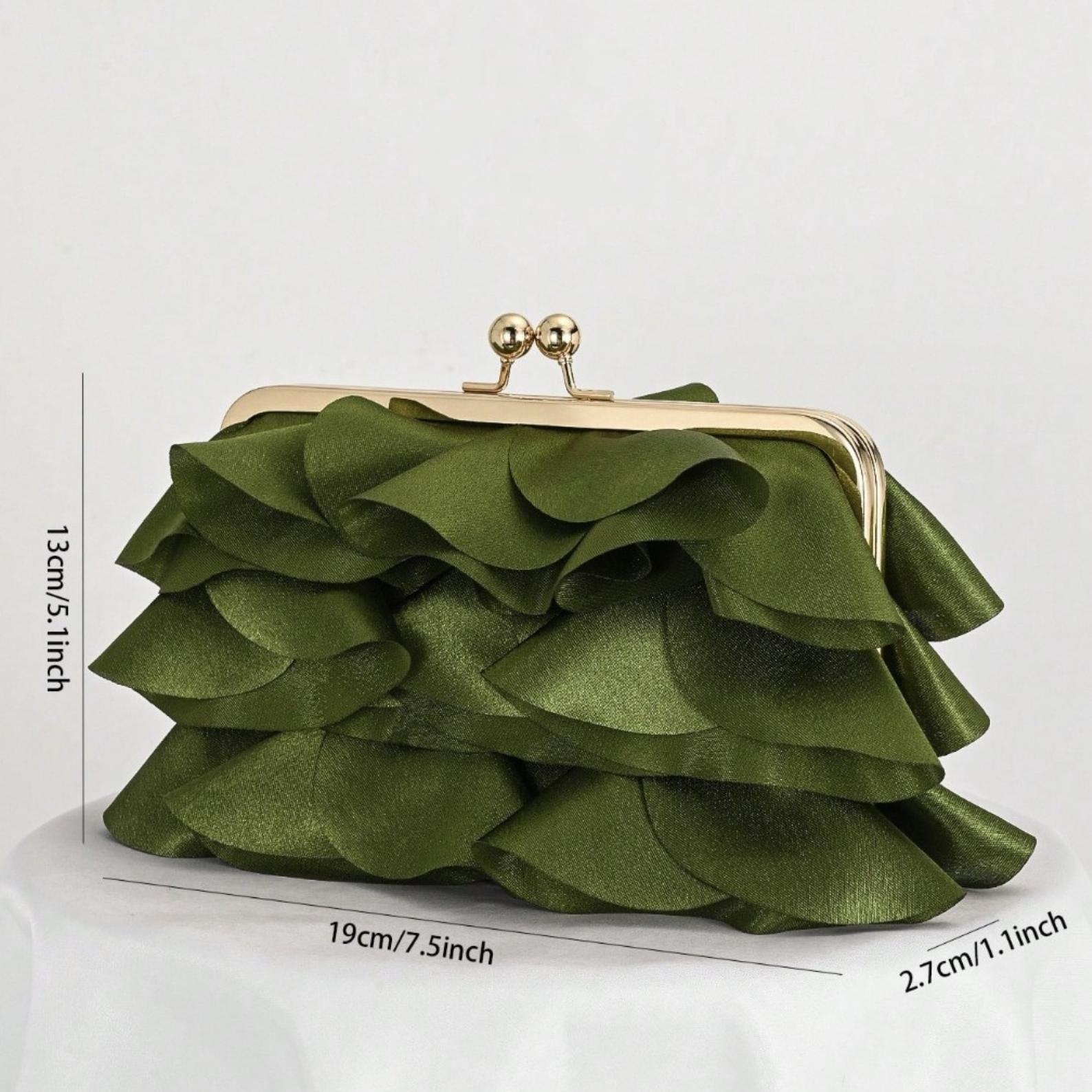 Elegant Ruffle Design: Olive green evening clutch with layered ruffle detailing for a soft, romantic, statement look.