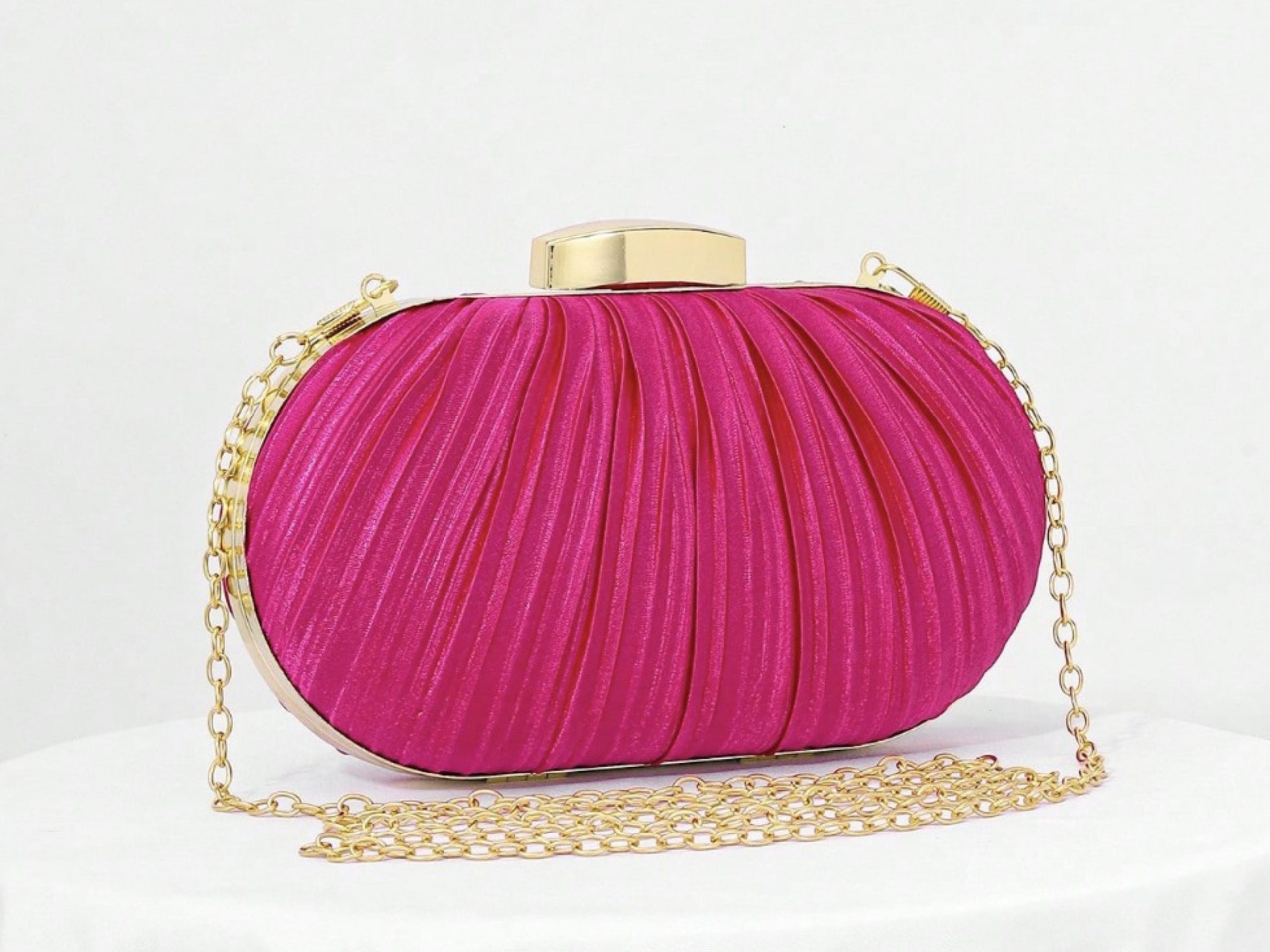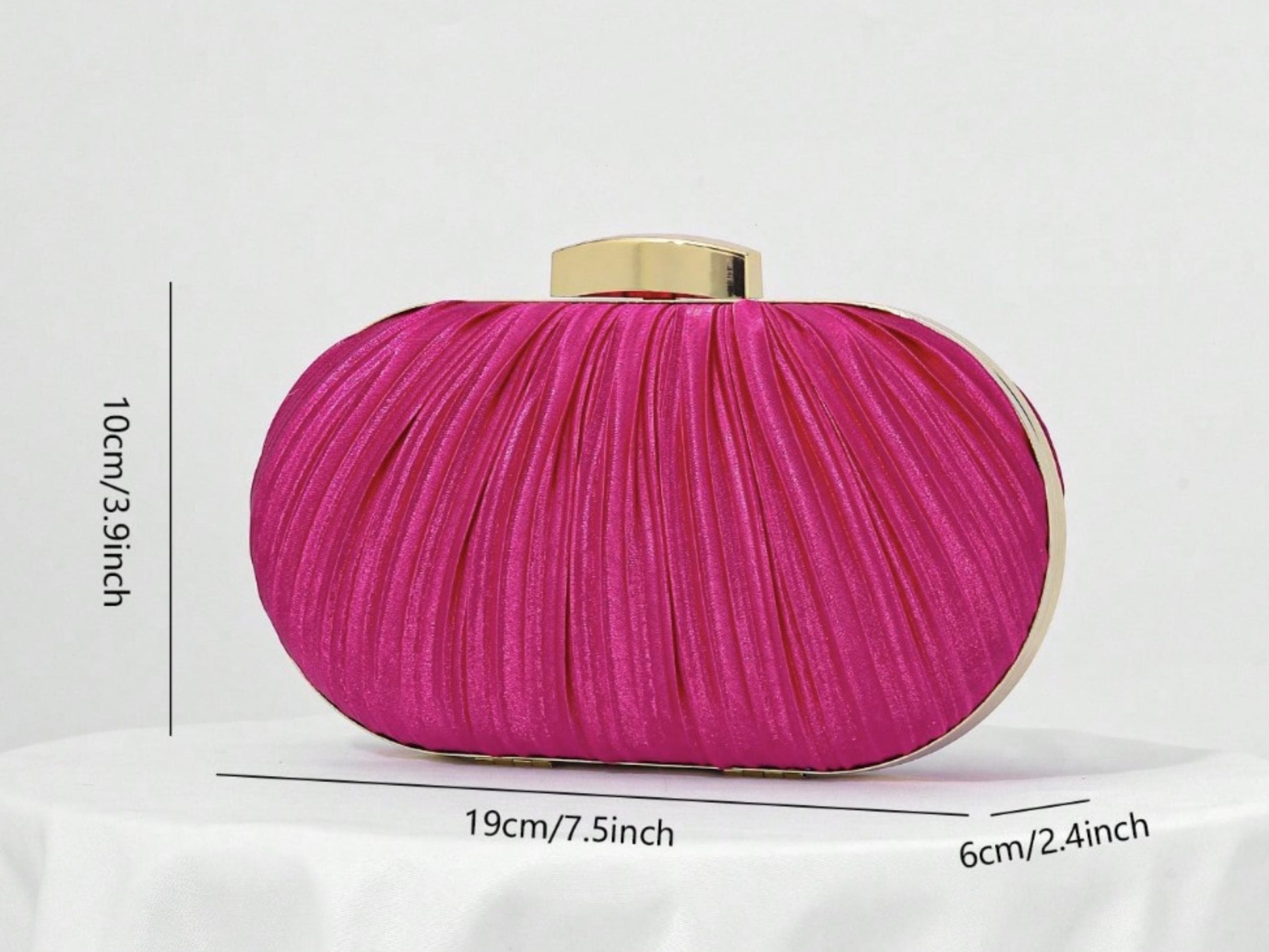 This fuchsia pink evening clutch features a structured oval box silhouette with elegant pleated detailing and gold-tone hardware for a chic formal finish. Designed to add a bold pop of color to wedding guest outfits, prom dresses, and cocktail looks, it is a stylish accessory for special occasions.